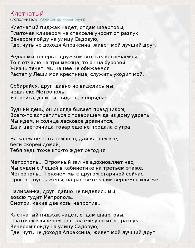 Это интересно:Александр Яковлевич Розенбаум (род. 13 сентября 1951, Ленинград) — исполнитель авторской песни.В 1968—1974 учился в Первом медицинском институте в Ленинграде. Работал врачом скорой помощи. Занимался в вечернем джазовом училище при Дворце культуры имени Кирова. Началом сольной деятельности можно считать памятное выступление 14 октября 1983 года в Доме культуры МВД имени Дзержинского.Розенбаум... продолжение