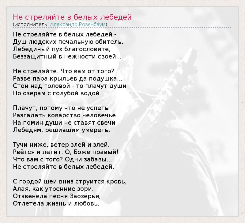 ГлавнаяИсполнителиАлександр РозенбаумНе стреляйте в белых лебедей