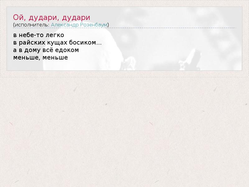 Это интересно:Александр Яковлевич Розенбаум (род. 13 сентября 1951, Ленинград) — исполнитель авторской песни.В 1968—1974 учился в Первом медицинском институте в Ленинграде. Работал врачом скорой помощи. Занимался в вечернем джазовом училище при Дворце культуры имени Кирова. Началом сольной деятельности можно считать памятное выступление 14 октября 1983 года в Доме культуры МВД имени Дзержинского.Розенбаум... продолжение