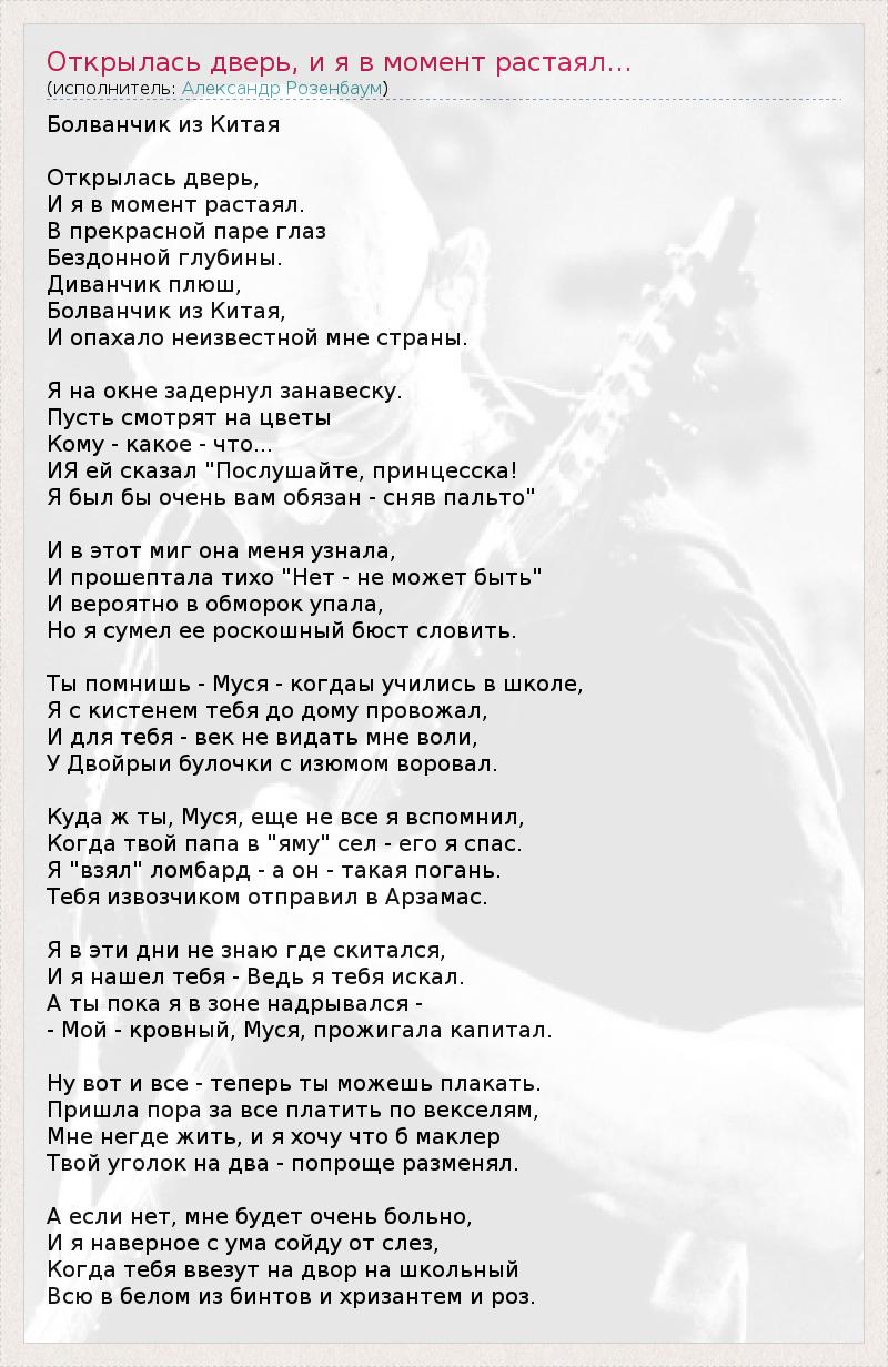 ГлавнаяИсполнителиАлександр РозенбаумОткрылась дверь, и я в момент растаял...