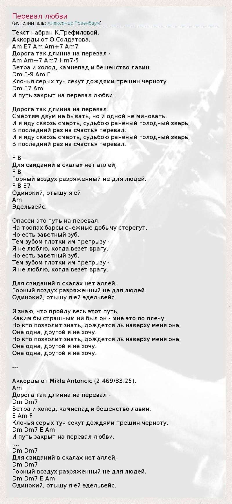 Текст набран К.Трефиловой. Аккорды от О.Солдатова. Am E7 Am Am+7 Am7 Дорога так длинна на перевал - Am Am+7 Am7 Hm7-5 Ветра и холод, камнепад и бешенство лавин. Dm E-9 Am F Клочья серых туч секут дождями трещин черноту. Dm E7 Am И путь закрыт на перевал любви. Дорога так длинна на перевал. Смертям двум не бывать, но и одной не миновать. И я иду сквозь смерть, судьбою раненый голодный зверь, В последний раз на счастья перевал. И я иду сквозь смерть, судьбою раненый голодный зверь, В последний раз на счастья перевал. F B Для свиданий в скалах нет аллей, F B Горный воздух разряженный не для людей. F B E7 Одинокий, отыщу я ей Am Эдельвейс. Опасен это путь на перевал. На тропах барсы снежные добычу стерегут. Но есть заветный зуб, Тем зубом глотки им прегрызу - Я не люблю, когда везет врагу. Но есть заветный зуб, Тем зубом глотки им прегрызу - Я не люблю, когда везет врагу. Для свиданий в скалах нет аллей, Горный воздух разряженный не для людей. Одинокий, отыщу я ей эдельвейс. Я знаю, что пройду весь этот путь, Каким бы страшным ни был он - мне это по плечу. Но кто позволит знать, дождется ль наверху меня она, Она одна, другой я не хочу. Но кто позволит знать, дождется ль наверху меня она, Она одна, другой я не хочу. Она одна, другой я не хочу. --- Аккорды от Mikle Antoncic (2:469/83.25). Am Дорога так длинна на перевал - Dm Dm7 Ветра и холод, камнепад и бешенство лавин. E Am F Клочья серых туч секут дождями трещин черноту. Dm Dm7 E Am И путь закрыт на перевал любви. .... Dm Dm7 Для свиданий в скалах нет аллей, Dm Dm7 Горный воздух разряженный не для людей. Dm Dm7 E Am Одинокий, отыщу я ей эдельвейс.