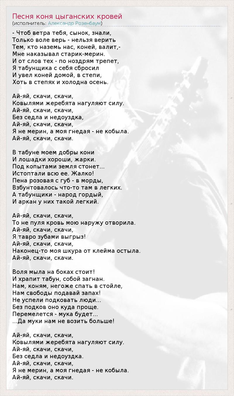 А как ты думаешь, о чем песня "Песня коня цыганских кровей" ?