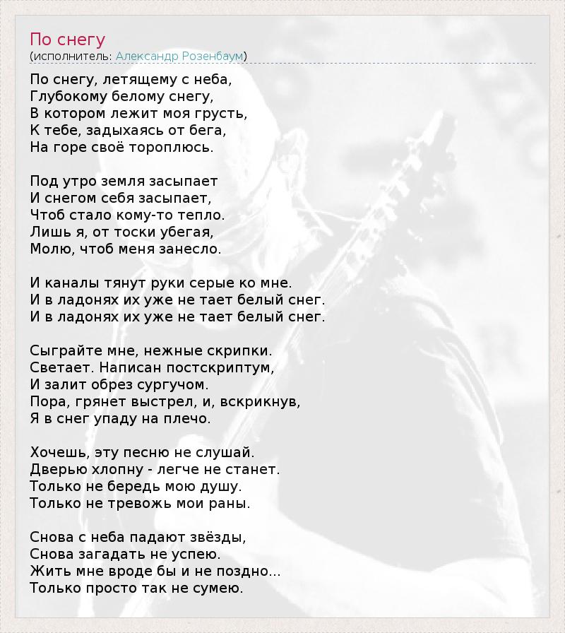 По снегу, летящему с неба, Глубокому белому снегу, В котором лежит моя грусть, К тебе, задыхаясь от бега, На горе своё тороплюсь. Под утро земля засыпает И снегом себя засыпает, Чтоб стало кому-то тепло. Лишь я, от тоски убегая, Молю, чтоб меня занесло. И каналы тянут руки серые ко мне. И в ладонях их уже не тает белый снег. И в ладонях их уже не тает белый снег. Сыграйте мне, нежные скрипки. Светает. Написан постскриптум, И залит обрез сургучом. Пора, грянет выстрел, и, вскрикнув, Я в снег упаду на плечо. Хочешь, эту песню не слушай. Дверью хлопну - легче не станет. Только не бередь мою душу. Только не тревожь мои раны. Снова с неба падают звёзды, Снова загадать не успею. Жить мне вроде бы и не поздно... Только просто так не сумею.