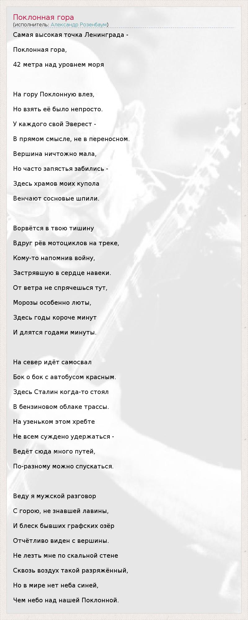 Самая высокая точка Ленинграда - Поклонная гора, 42 метра над уровнем моря На гору Поклонную влез, Но взять её было непросто. У каждого свой Эверест - В прямом смысле, не в переносном. Вершина ничтожно мала, Но часто запястья забились - Здесь храмов моих купола Венчают сосновые шпили. Ворвётся в твою тишину Вдруг рёв мотоциклов на треке, Кому-то напомнив войну, Застрявшую в сердце навеки. От ветра не спрячешься тут, Морозы особенно люты, Здесь годы короче минут И длятся годами минуты. На север идёт самосвал Бок о бок с автобусом красным. Здесь Сталин когда-то стоял В бензиновом облаке трассы. На узеньком этом хребте Не всем суждено удержаться - Ведёт сюда много путей, По-разному можно спускаться. Веду я мужской разговор С горою, не знавшей лавины, И блеск бывших графских озёр Отчётливо виден с вершины. Не лезть мне по скальной стене Сквозь воздух такой разряжённый, Но в мире нет неба синей, Чем небо над нашей Поклонной.