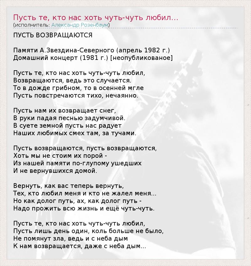 ГлавнаяИсполнителиАлександр РозенбаумПусть те, кто нас хоть чуть-чуть любил...