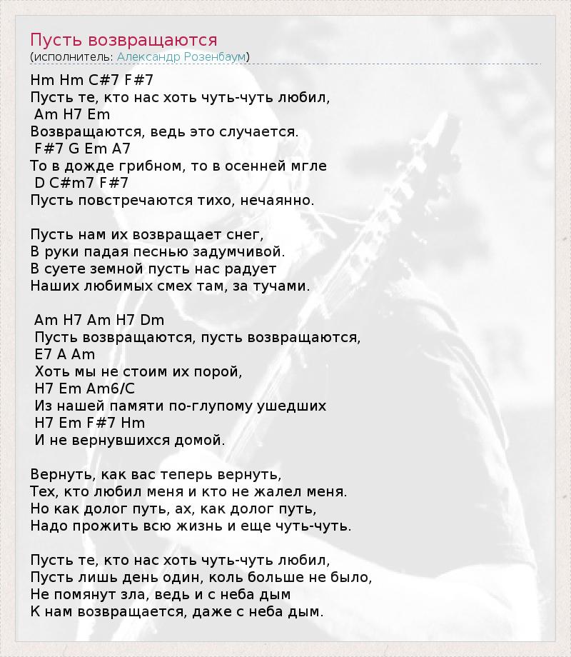 Hm Hm C#7 F#7 Пусть те, кто нас хоть чуть-чуть любил, Am H7 Em Возвращаются, ведь это случается. F#7 G Em A7 То в дожде грибном, то в осенней мгле D C#m7 F#7 Пусть повстречаются тихо, нечаянно. Пусть нам их возвращает снег, В руки падая песнью задумчивой. В суете земной пусть нас радует Наших любимых смех там, за тучами. Am H7 Am H7 Dm Пусть возвращаются, пусть возвращаются, E7 А Am Хоть мы не стоим их порой, H7 Em Am6/C Из нашей памяти по-глупому ушедших H7 Em F#7 Hm И не вернувшихся домой. Вернуть, как вас теперь вернуть, Тех, кто любил меня и кто не жалел меня. Но как долог путь, ах, как долог путь, Надо прожить всю жизнь и еще чуть-чуть. Пусть те, кто нас хоть чуть-чуть любил, Пусть лишь день один, коль больше не было, Не помянут зла, ведь и с неба дым К нам возвращается, даже с неба дым.