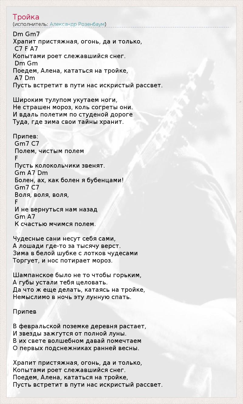 Это интересно:Александр Яковлевич Розенбаум (род. 13 сентября 1951, Ленинград) — исполнитель авторской песни.В 1968—1974 учился в Первом медицинском институте в Ленинграде. Работал врачом скорой помощи. Занимался в вечернем джазовом училище при Дворце культуры имени Кирова. Началом сольной деятельности можно считать памятное выступление 14 октября 1983 года в Доме культуры МВД имени Дзержинского.Розенбаум... продолжение