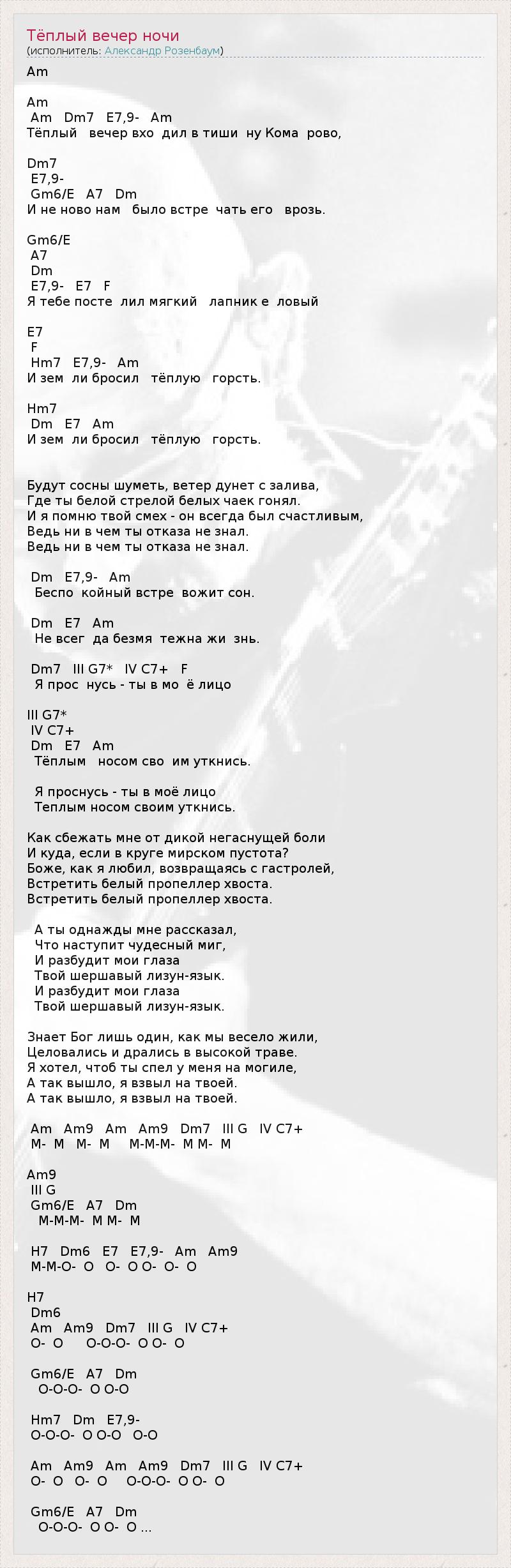 Это интересно:Александр Яковлевич Розенбаум (род. 13 сентября 1951, Ленинград) — исполнитель авторской песни.В 1968—1974 учился в Первом медицинском институте в Ленинграде. Работал врачом скорой помощи. Занимался в вечернем джазовом училище при Дворце культуры имени Кирова. Началом сольной деятельности можно считать памятное выступление 14 октября 1983 года в Доме культуры МВД имени Дзержинского.Розенбаум... продолжение