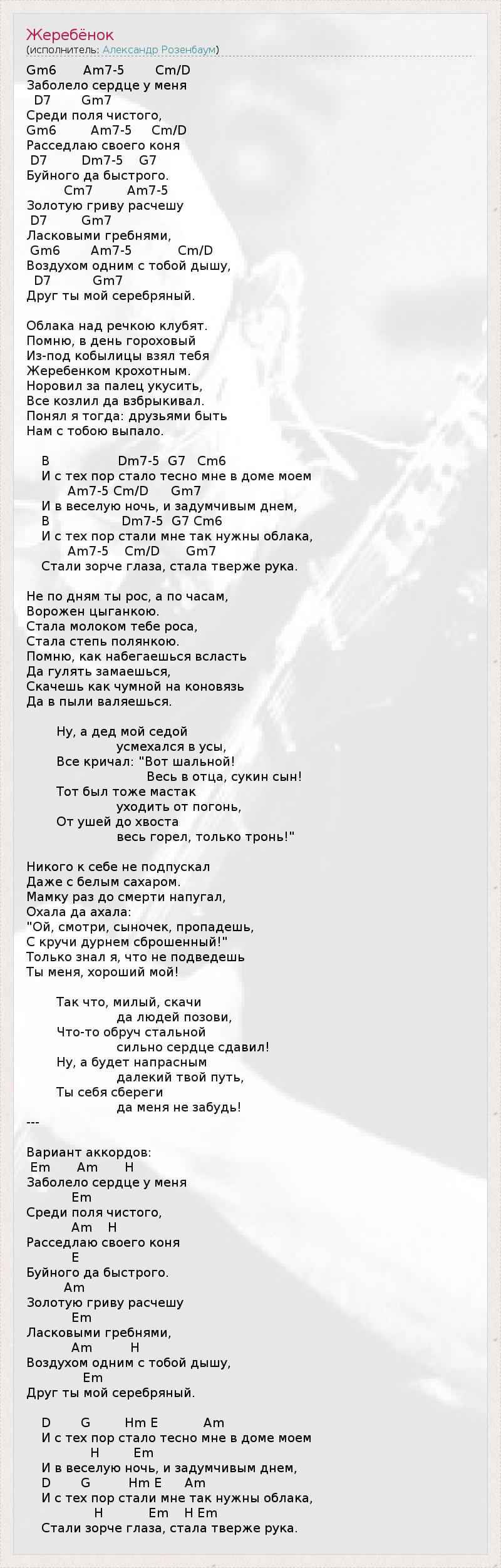 Это интересно:Александр Яковлевич Розенбаум (род. 13 сентября 1951, Ленинград) — исполнитель авторской песни.В 1968—1974 учился в Первом медицинском институте в Ленинграде. Работал врачом скорой помощи. Занимался в вечернем джазовом училище при Дворце культуры имени Кирова. Началом сольной деятельности можно считать памятное выступление 14 октября 1983 года в Доме культуры МВД имени Дзержинского.Розенбаум... продолжение