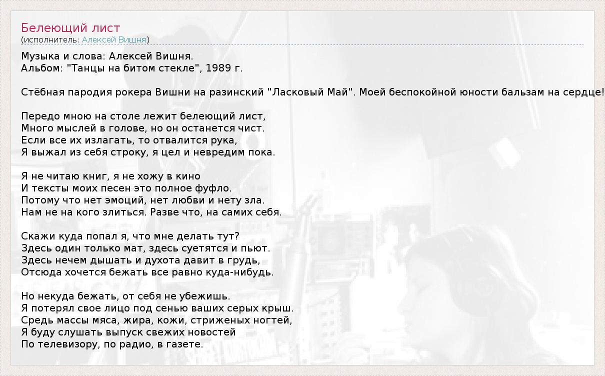 Музыка и слова: Алексей Вишня. Альбом: "Танцы на битом стекле", 1989 г. Стёбная пародия рокера Вишни на разинский "Ласковый Май". Моей беспокойной юности бальзам на сердце! Передо мною на столе лежит белеющий лист, Много мыслей в голове, но он останется чист. Если все их излагать, то отвалится рука, Я выжал из себя строку, я цел и невредим пока. Я не читаю книг, я не хожу в кино И тексты моих песен это полное фуфло. Потому что нет эмоций, нет любви и нету зла. Нам не на кого злиться. Разве что, на самих себя. Скажи куда попал я, что мне делать тут? Здесь один только мат, здесь суетятся и пьют. Здесь нечем дышать и духота давит в грудь, Отсюда хочется бежать все равно куда-нибудь. Но некуда бежать, от себя не убежишь. Я потерял свое лицо под сенью ваших серых крыш. Средь массы мяса, жира, кожи, стриженых ногтей, Я буду слушать выпуск свежих новостей По телевизору, по радио, в газете.