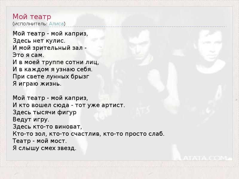 Это интересно:«Алиса» — русская рок-группа, образованная в 1983 году в Ленинграде. С 1985 года лидером группы и основным автором песен является вокалист Константин Кинчев.На всём протяжении своей длительной и эффектной карьеры на отечественной рок-сцене питеpская гpуппа АЛИСА является одним её безусловных лидеpов, неизменно пpивлекая внимание сpедств массовой инфоpмации своей бурной pок-н-pолльной... продолжение