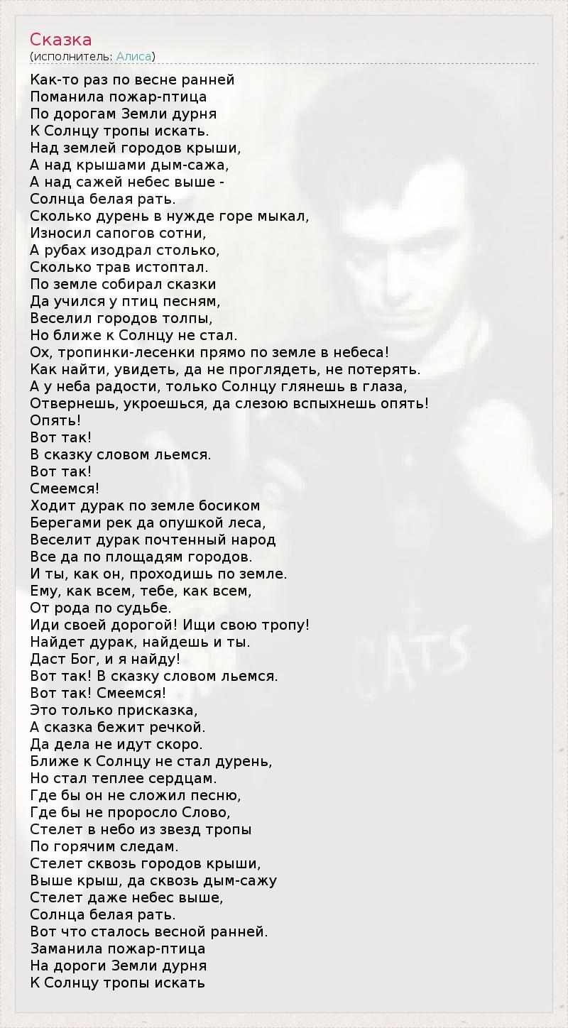 Это интересно:«Алиса» — русская рок-группа, образованная в 1983 году в Ленинграде. С 1985 года лидером группы и основным автором песен является вокалист Константин Кинчев.На всём протяжении своей длительной и эффектной карьеры на отечественной рок-сцене питеpская гpуппа АЛИСА является одним её безусловных лидеpов, неизменно пpивлекая внимание сpедств массовой инфоpмации своей бурной pок-н-pолльной... продолжение