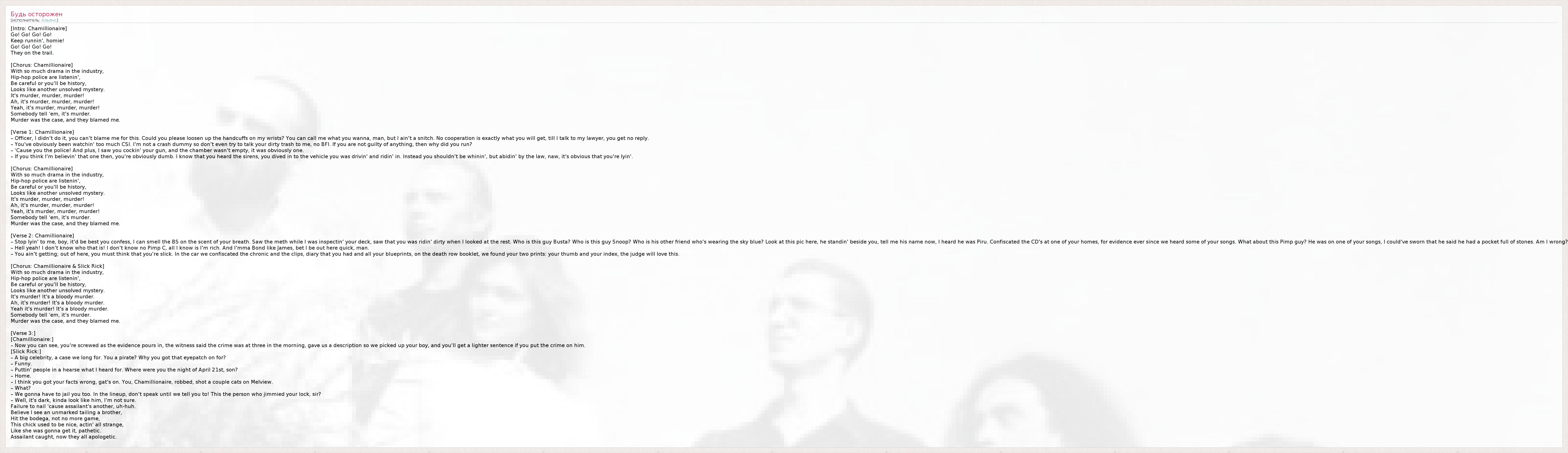 –	Прекрати врать мне, парень! Тебе лучше всего признаться, я по дыханию чувствую, что ты прометаешь де**мо. Я видел мет, когда обыскивал твой стол. Видел, что ты проехал с дурью, пока я смотрел на других. Что это за парень Баста? Кто такой Снуп? Кто его другой приятель в голубом? Смотри на фото, вот он стоит рядом с тобой. Назвал мне его имя! Я слышал, что он из Пайру. Мы конфисковали диск у одного из твоих дружков, для доказательства послушали некоторые твои песни. Что там за Пимп, он был с тобой на какой-то песне, я мог бы поклясться, что он сказал: "Полный карман крэка". Или я не прав?  1