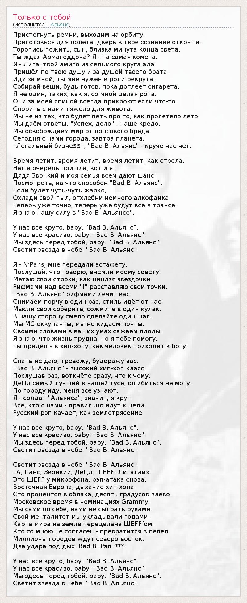 Пристегнуть ремни, выходим на орбиту. Приготовься для полёта, дверь в твоё сознание открыта. Торопись пожить, сын, близка минута конца света. Ты ждал Армагеддона? Я - та самая комета. Я - Лига, твой амиго из седьмого круга ада. Пришёл по твою душу и за душой твоего брата. Иди за мной, ты мне нужен в роли рекрута. Собирай вещи, будь готов, пока дотлеет сигарета. Я не один, таких, как я, со мной целая рота. Они за моей спиной всегда прикроют если что-то. Спорить с нами тяжело для живота. Мы не из тех, кто будет петь про то, как пролетело лето. Мы даём ответы. "Успех, дело" - наше кредо. Мы освобождаем мир от попсового бреда. Сегодня с нами города, завтра планета. "Легальный бизне$$", "Bad B. Альянс" - круче нас нет. Время летит, время летит, время летит, как стрела. Наша очередь пришла, вот и я. Дядя Звонкий и моя семья всем дают шанс Посмотреть, на что способен "Bad B. Альянс". Если будет чуть-чуть жарко, Охлади свой пыл, отхлебни немного алкофанка. Теперь уже точно, теперь уже будут все в трансе. Я знаю нашу силу в "Bad B. Альянсе". У нас всё круто, baby. "Bad B. Альянс". У нас всё красиво, baby. "Bad B. Альянс". Мы здесь перед тобой, baby. "Bad B. Альянс". Светит звезда в небе. "Bad B. Альянс". Я - N’Pans, мне передали эстафету. Послушай, что говорю, внемли моему совету. Метаю свои строки, как ниндзя звёздочки. Рифмами над всеми "i" расставляю свои точки. "Bad B. Альянс" рифмами лечит вас. Снимаем порчу в один раз, стиль идёт от нас. Мысли свои соберите, сожмите в один кулак. В нашу сторону смело сделайте один шаг. Мы МС-оккупанты, мы не кидаем понты. Своими словами в ваших умах сажаем плоды. Я знаю, что жизнь трудна, но я тебе помогу. Ты придёшь к хип-хопу, как человек приходит к богу. Спать не даю, тревожу, будоражу вас. "Bad B. Альянс" - высокий хип-хоп класс. Послушав раз, воткнёте сразу, что к чему. ДеЦл самый лучший в нашей тусе, ошибиться не могу. По городу иду, меня все узнают. Я - солдат "Альянса", значит, я крут. Все, кто с нами - правильно идут к цели. Русский рэп качает, как землетрясение. У нас всё круто, baby. "Bad B. Альянс". У нас всё красиво, baby. "Bad B. Альянс". Мы здесь перед тобой, baby. "Bad B. Альянс". Светит звезда в небе. "Bad B. Альянс". Светит звезда в небе. "Bad B. Альянс". LA, Панс, Звонкий, ДеЦл, ШЕFF, Лигалайз. Это ШЕFF у микрофона, рэп-атака снова. Восточная Европа, дыхание хип-хопа. Сто процентов в облака, десять градусов влево. Московское время в номинациях Grammy. Мы сами по себе, нами не сыграть руками. Свой менталитет мы укладывали годами. Карта мира на земле переделана ШЕFF’ом. Кто со мною не согласен - превратится в пепел. Миллионы городов ждут северо-восток. Два удара под дых. Bad B. Рэп. ***. У нас всё круто, baby. "Bad B. Альянс". У нас всё красиво, baby. "Bad B. Альянс". Мы здесь перед тобой, baby. "Bad B. Альянс". Светит звезда в небе. "Bad B. Альянс".