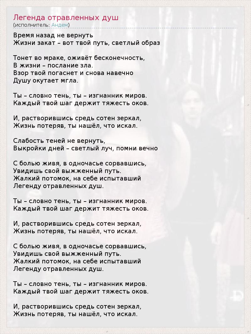 Время назад не вернуть Жизни закат – вот твой путь, светлый образ Тонет во мраке, оживёт бесконечность, В жизни – послание зла. Взор твой погаснет и снова навечно Душу окутает мгла. Ты – словно тень, ты – изгнанник миров. Каждый твой шаг держит тяжесть оков. И, растворившись средь сотен зеркал, Жизнь потеряв, ты нашёл, что искал. Слабость теней не вернуть, Выкройки дней – светлый луч, помни вечно С болью живя, в одночасье сорвавшись, Увидишь свой выжженный путь. Жалкий потомок, на себе испытавший Легенду отравленных душ. Ты – словно тень, ты – изгнанник миров. Каждый твой шаг держит тяжесть оков. И, растворившись средь сотен зеркал, Жизнь потеряв, ты нашёл, что искал. С болью живя, в одночасье сорвавшись, Увидишь свой выжженный путь. Жалкий потомок, на себе испытавший Легенду отравленных душ. Ты – словно тень, ты – изгнанник миров. Каждый твой шаг держит тяжесть оков. И, растворившись средь сотен зеркал, Жизнь потеряв, ты нашёл, что искал.