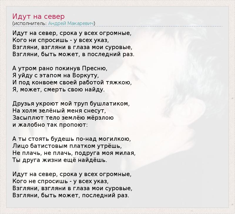 Идут на север, срока у всех огромные, Кого ни спросишь - у всех указ, Взгляни, взгляни в глаза мои суровые, Взгляни, быть может, в последний раз. А утром рано покинув Пресню, Я уйду с этапом на Воркуту, И под конвоем своей работой тяжкою, Я, может, смерть свою найду. Друзья укроют мой труп бушлатиком, На холм зелёный меня снесут, Засыплют тело землёю мёрзлою и жалобно так пропоют: А ты стоять будешь по-над могилкою, Лицо батистовым платком утрёшь, Не плачь, не плачь, подруга моя милая, Ты друга жизни ещё найдёшь. Идут на север, срока у всех огромные, Кого не спросишь - у всех указ, Взгляни, взгляни в глаза мои суровые, Взгляни, быть может, последний раз.