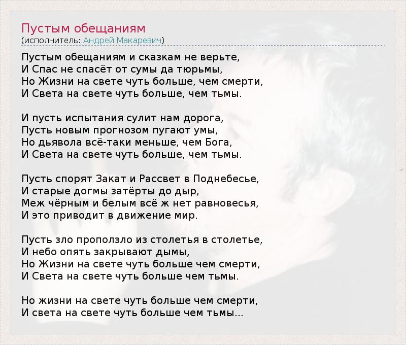 А как ты думаешь, о чем песня "Пустым обещаниям" ?