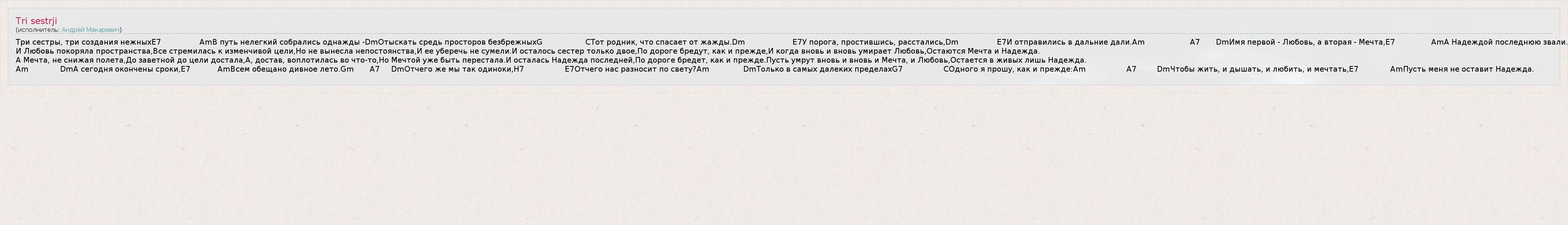 Три сестры, три создания нежныхE7                 AmВ путь нелегкий собрались однажды -DmОтыскать средь просторов безбрежныхG                   CТот родник, что спасает от жажды.Dm                     E7У порога, простившись, расстались,Dm                 E7И отправились в дальние дали.Am                    A7       DmИмя первой - Любовь, а вторая - Мечта,E7                AmА Надеждой последнюю звали.
