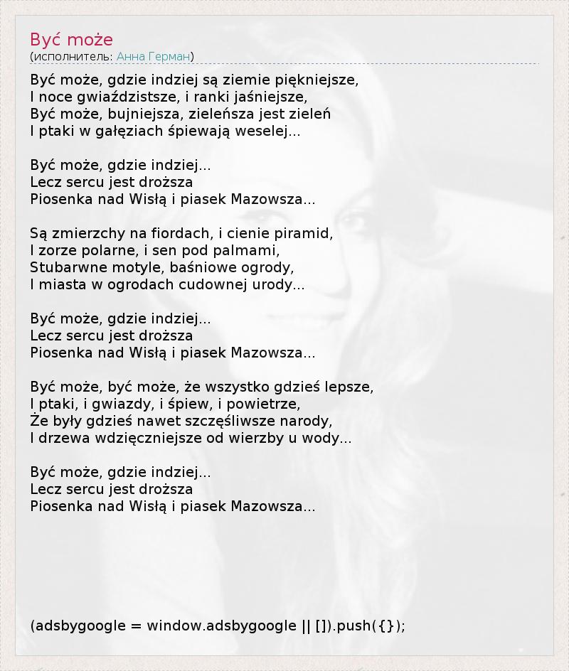 Это интересно:А́нна Виктория Ге́рман (польск. Anna German; нем. Anna Hörmann; 14 февраля 1936, Ургенч, Узбекская ССР, СССР — 26 августа 1982,Варшава, Польская Народная Республика) — польская певица и композитор, звезда эстрады и оперы 1960-х — начала 1980-х годов, известна в основном как исполнительница эстрадных песен на разных языках мира, в первую очередь, на польском и русском. Выступала в США, Канаде, Великобритании,... продолжение
