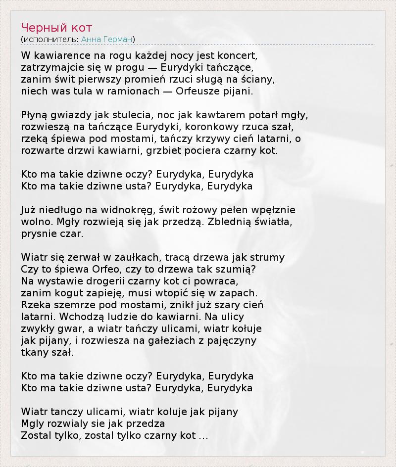W kawiarence na rogu każdej nocy jest koncert, zatrzymajcie się w progu — Eurydyki tańczące, zanim świt pierwszy promień rzuci sługą na ściany, niech was tula w ramionach — Orfeusze pijani. Płyną gwiazdy jak stulecia, noc jak kawtarem potarł mgły, rozwieszą na tańczące Eurydyki, koronkowy rzuca szał, rzeką śpiewa pod mostami, tańczy krzywy cień latarni, o rozwarte drzwi kawiarni, grzbiet pociera czarny kot. Kto ma takie dziwne oczy? Eurydyka, Eurydyka Kto ma takie dziwne usta? Eurydyka, Eurydyka Już niedługo na widnokręg, świt rożowy pełen wpęłznie wolno. Mgły rozwieją się jak przedzą. Zblednią światła, prysnie czar. Wiatr się zerwał w zaułkach, tracą drzewa jak strumy Czy to śpiewa Orfeo, czy to drzewa tak szumią? Na wystawie drogerii czarny kot ci powraca, zanim kogut zapieję, musi wtopić się w zapach. Rzeka szemrze pod mostami, znikł już szary cień latarni. Wchodzą ludzie do kawiarni. Na ulicy zwykły gwar, a wiatr tańczy ulicami, wiatr kołuje jak pijany, i rozwiesza na gałeziach z pajęczyny tkany szał. Kto ma takie dziwne oczy? Eurydyka, Eurydyka Kto ma takie dziwne usta? Eurydyka, Eurydyka Wiatr tanczy ulicami, wiatr koluje jak pijany Mgly rozwialy sie jak przedza Zostal tylko, zostal tylko czarny kot …