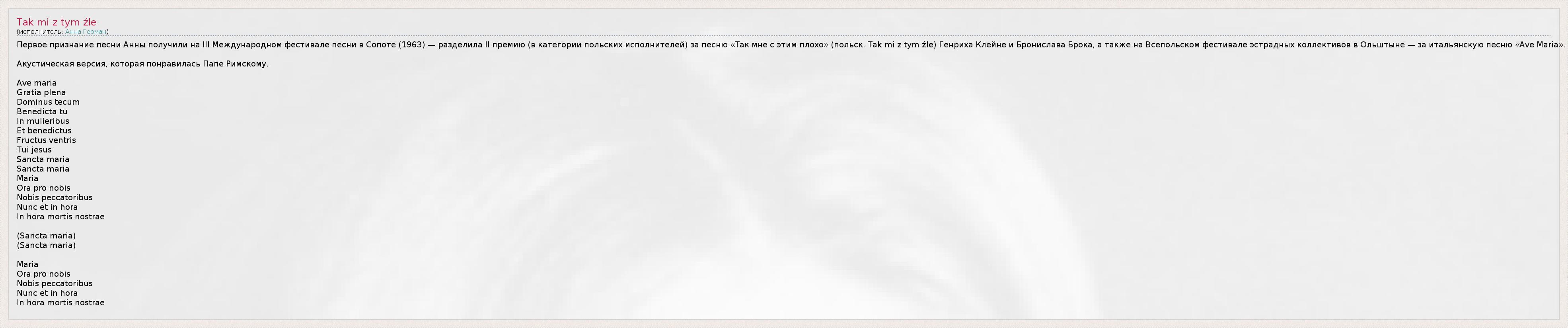 Первое признание песни Анны получили на ІІІ Международном фестивале песни в Сопоте (1963) — разделила ІІ премию (в категории польских исполнителей) за песню «Так мне с этим плохо» (польск. Tak mi z tym źle) Генриха Клейне и Бронислава Брока, а также на Всепольском фестивале эстрадных коллективов в Ольштыне — за итальянскую песню «Ave Maria». Акустическая версия, которая понравилась Папе Римскому. Ave maria Gratia plena Dominus tecum Benedicta tu In mulieribus Et benedictus Fructus ventris Tui jesus Sancta maria Sancta maria Maria Ora pro nobis Nobis peccatoribus Nunc et in hora In hora mortis nostrae (Sancta maria) (Sancta maria) Maria Ora pro nobis Nobis peccatoribus Nunc et in hora In hora mortis nostrae