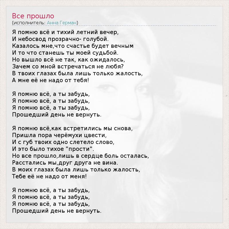 Это интересно:А́нна Виктория Ге́рман (польск. Anna German; нем. Anna Hörmann; 14 февраля 1936, Ургенч, Узбекская ССР, СССР — 26 августа 1982,Варшава, Польская Народная Республика) — польская певица и композитор, звезда эстрады и оперы 1960-х — начала 1980-х годов, известна в основном как исполнительница эстрадных песен на разных языках мира, в первую очередь, на польском и русском. Выступала в США, Канаде, Великобритании,... продолжение