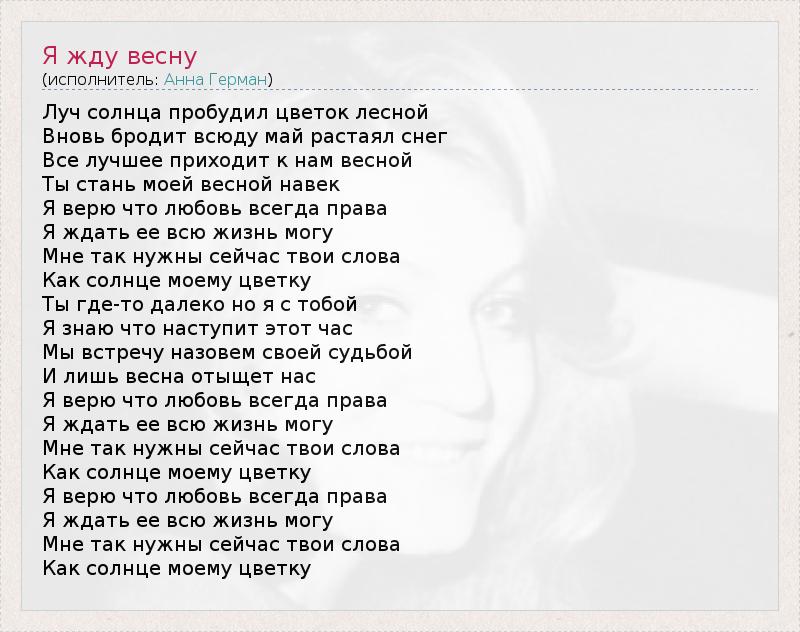 Луч солнца пробудил цветок лесной Вновь бродит всюду май растаял снег Все лучшее приходит к нам весной Ты стань моей весной навек Я верю что любовь всегда права Я ждать ее всю жизнь могу Мне так нужны сейчас твои слова Как солнце моему цветку Ты где-то далеко но я с тобой Я знаю что наступит этот час Мы встречу назовем своей судьбой И лишь весна отыщет нас Я верю что любовь всегда права Я ждать ее всю жизнь могу Мне так нужны сейчас твои слова Как солнце моему цветку Я верю что любовь всегда права Я ждать ее всю жизнь могу Мне так нужны сейчас твои слова Как солнце моему цветку