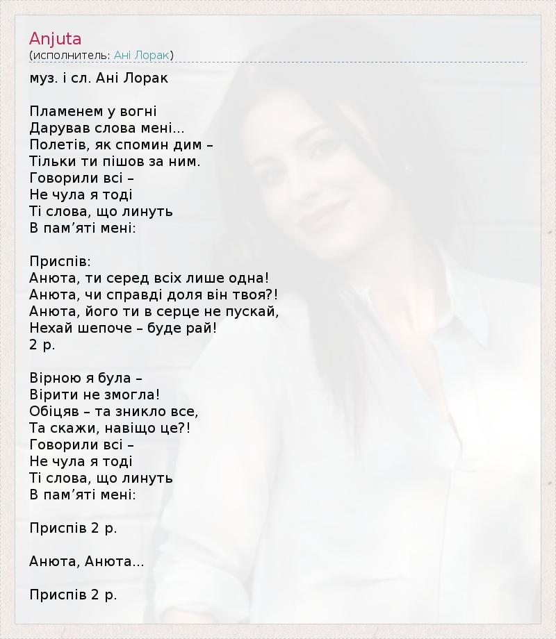 муз. і сл. Ані Лорак Пламенем у вогні Дарував слова мені... Полетів, як спомин дим – Тільки ти пішов за ним. Говорили всі – Не чула я тоді Ті слова, що линуть В пам’яті мені: Приспів: Анюта, ти серед всіх лише одна! Анюта, чи справді доля він твоя?! Анюта, його ти в серце не пускай, Нехай шепоче – буде рай! 2 р. Вірною я була – Вірити не змогла! Обіцяв – та зникло все, Та скажи, навіщо це?! Говорили всі – Не чула я тоді Ті слова, що линуть В пам’яті мені: Приспів 2 р. Анюта, Анюта... Приспів 2 р.
