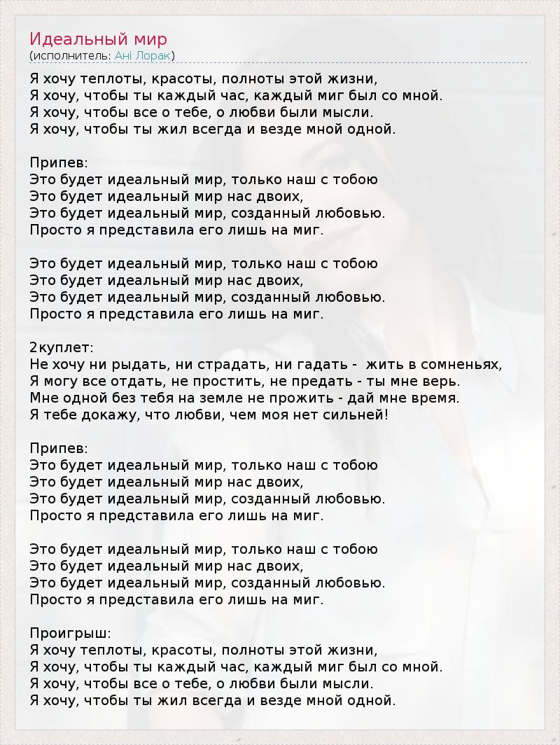 Я хочу теплоты, красоты, полноты этой жизни, Я хочу, чтобы ты каждый час, каждый миг был со мной. Я хочу, чтобы все о тебе, о любви были мысли. Я хочу, чтобы ты жил всегда и везде мной одной. Припев: Это будет идеальный мир, только наш с тобою Это будет идеальный мир нас двоих, Это будет идеальный мир, созданный любовью. Просто я представила его лишь на миг. Это будет идеальный мир, только наш с тобою Это будет идеальный мир нас двоих, Это будет идеальный мир, созданный любовью. Просто я представила его лишь на миг. 2куплет: Не хочу ни рыдать, ни страдать, ни гадать - жить в сомненьях, Я могу все отдать, не простить, не предать - ты мне верь. Мне одной без тебя на земле не прожить - дай мне время. Я тебе докажу, что любви, чем моя нет сильней! Припев: Это будет идеальный мир, только наш с тобою Это будет идеальный мир нас двоих, Это будет идеальный мир, созданный любовью. Просто я представила его лишь на миг. Это будет идеальный мир, только наш с тобою Это будет идеальный мир нас двоих, Это будет идеальный мир, созданный любовью. Просто я представила его лишь на миг. Проигрыш: Я хочу теплоты, красоты, полноты этой жизни, Я хочу, чтобы ты каждый час, каждый миг был со мной. Я хочу, чтобы все о тебе, о любви были мысли. Я хочу, чтобы ты жил всегда и везде мной одной.
