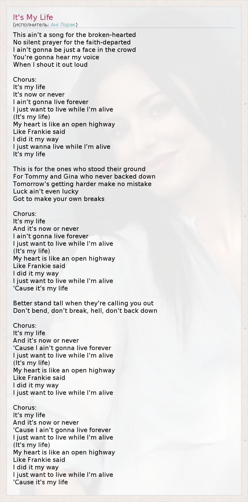 This ain't a song for the broken-hearted No silent prayer for the faith-departed I ain't gonna be just a face in the crowd You're gonna hear my voice When I shout it out loud Chorus: It's my life It's now or never I ain't gonna live forever I just want to live while I'm alive (It's my life) My heart is like an open highway Like Frankie said I did it my way I just wanna live while I'm alive It's my life This is for the ones who stood their ground For Tommy and Gina who never backed down Tomorrow's getting harder make no mistake Luck ain't even lucky Got to make your own breaks Chorus: It's my life And it's now or never I ain't gonna live forever I just want to live while I'm alive (It's my life) My heart is like an open highway Like Frankie said I did it my way I just want to live while I'm alive 'Cause it's my life Better stand tall when they're calling you out Don't bend, don't break, hell, don't back down Chorus: It's my life And it's now or never 'Cause I ain't gonna live forever I just want to live while I'm alive (It's my life) My heart is like an open highway Like Frankie said I did it my way I just want to live while I'm alive Chorus: It's my life And it's now or never 'Cause I ain't gonna live forever I just want to live while I'm alive (It's my life) My heart is like an open highway Like Frankie said I did it my way I just want to live while I'm alive 'Cause it's my life