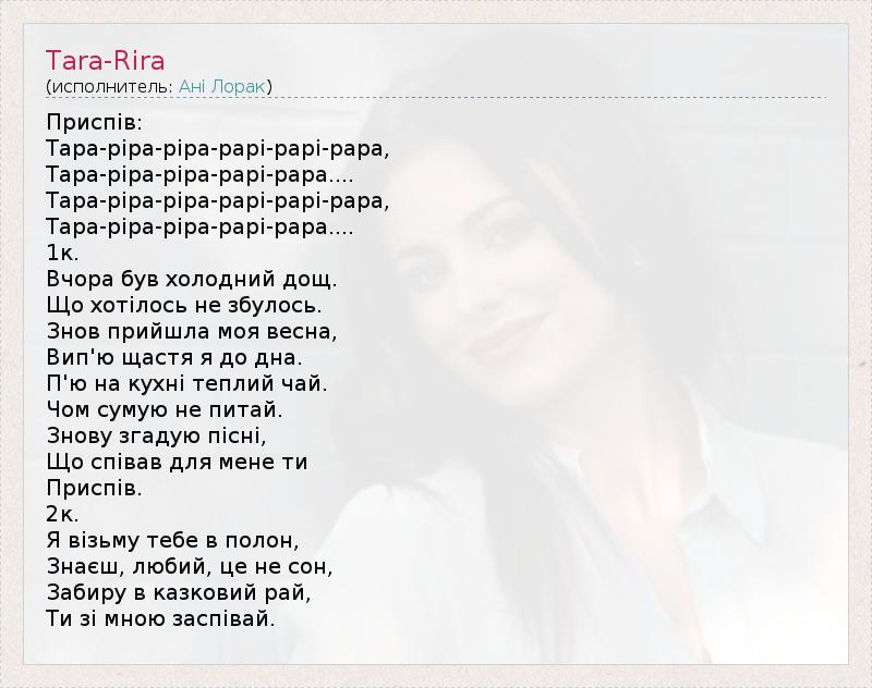 Приспів: Тара-ріра-ріра-рарі-рарі-рара, Тара-ріра-ріра-рарі-рара.... Тара-ріра-ріра-рарі-рарі-рара, Тара-ріра-ріра-рарі-рара.... 1к. Вчора був холодний дощ. Що хотілось не збулось. Знов прийшла моя весна, Вип'ю щастя я до дна. П'ю на кухні теплий чай. Чом сумую не питай. Знову згадую пісні, Що співав для мене ти Приспів. 2к. Я візьму тебе в полон, Знаєш, любий, це не сон, Забиру в казковий рай, Ти зі мною заспівай.