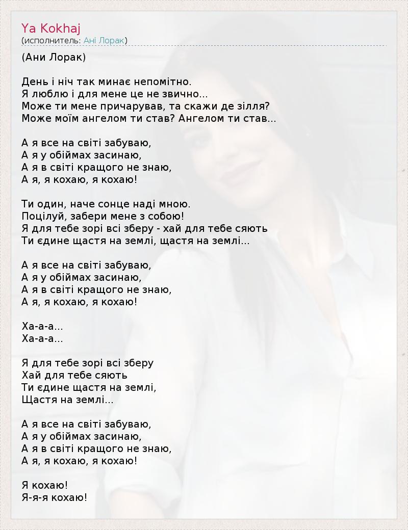 (Ани Лорак) День і ніч так минає непомітно. Я люблю і для мене це не звично... Може ти мене причарував, та скажи де зілля? Може моїм ангелом ти став? Ангелом ти став... А я все на світі забуваю, А я у обіймах засинаю, А я в світі кращого не знаю, А я, я кохаю, я кохаю! Ти один, наче сонце наді мною. Поцілуй, забери мене з собою! Я для тебе зорі всі зберу - хай для тебе сяють Ти єдине щастя на землі, щастя на землі... А я все на світі забуваю, А я у обіймах засинаю, А я в світі кращого не знаю, А я, я кохаю, я кохаю! Ха-а-а... Ха-а-а... Я для тебе зорі всі зберу Хай для тебе сяють Ти єдине щастя на землі, Щастя на землі... А я все на світі забуваю, А я у обіймах засинаю, А я в світі кращого не знаю, А я, я кохаю, я кохаю! Я кохаю! Я-я-я кохаю!