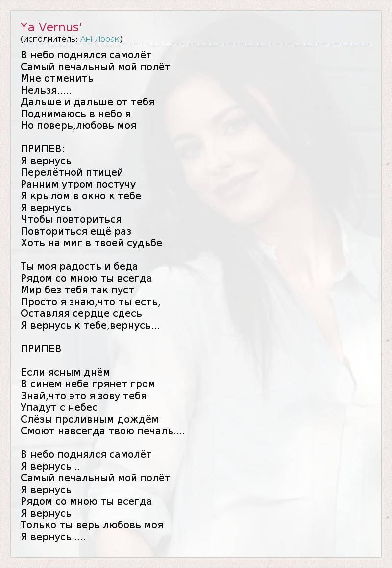 В небо поднялся самолёт Самый печальный мой полёт Мне отменить Нельзя..... Дальше и дальше от тебя Поднимаюсь в небо я Но поверь,любовь моя ПРИПЕВ: Я вернусь Перелётной птицей Ранним утром постучу Я крылом в окно к тебе Я вернусь Чтобы повториться Повториться ещё раз Хоть на миг в твоей судьбе Ты моя радость и беда Рядом со мною ты всегда Мир без тебя так пуст Просто я знаю,что ты есть, Оставляя сердце сдесь Я вернусь к тебе,вернусь... ПРИПЕВ Если ясным днём В синем небе грянет гром Знай,что это я зову тебя Упадут с небес Слёзы проливным дождём Смоют навсегда твою печаль.... В небо поднялся самолёт Я вернусь... Самый печальный мой полёт Я вернусь Рядом со мною ты всегда Я вернусь Только ты верь любовь моя Я вернусь.....