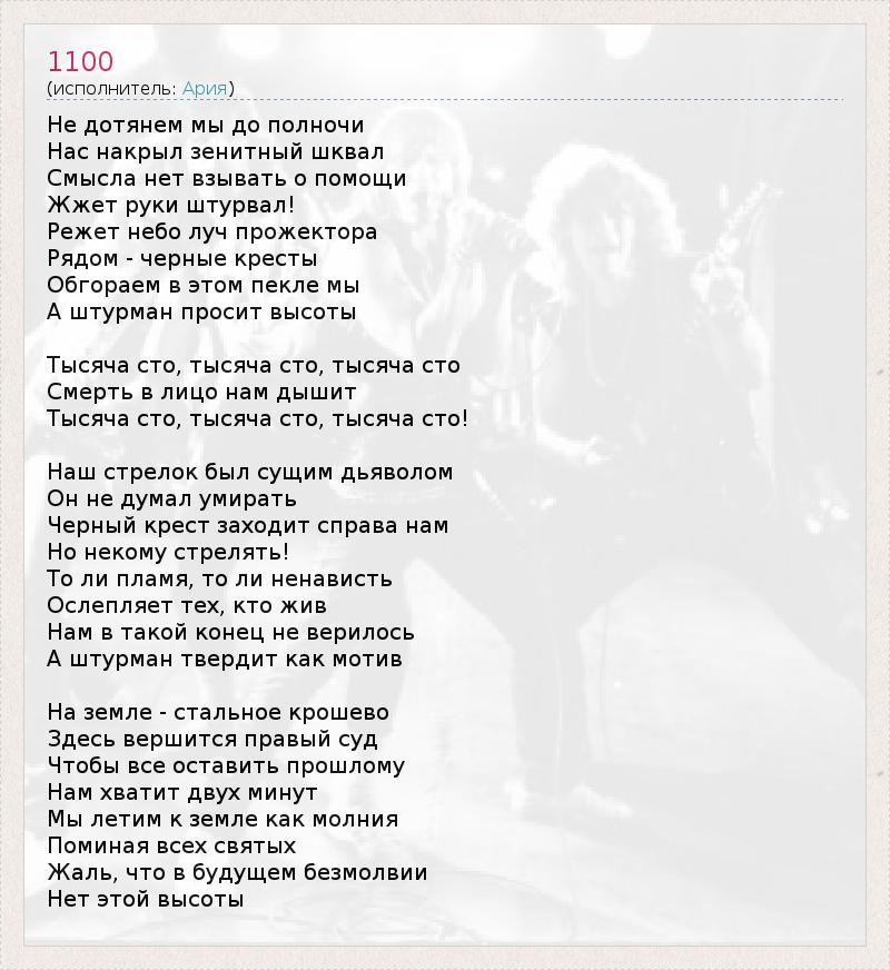 Песня "1100" написана Пушкиной по рассказам её отца, ветерана-бомбардировщика Анатолия Пушкина. 1100 метров - это оптимальная высота для бомбометания.