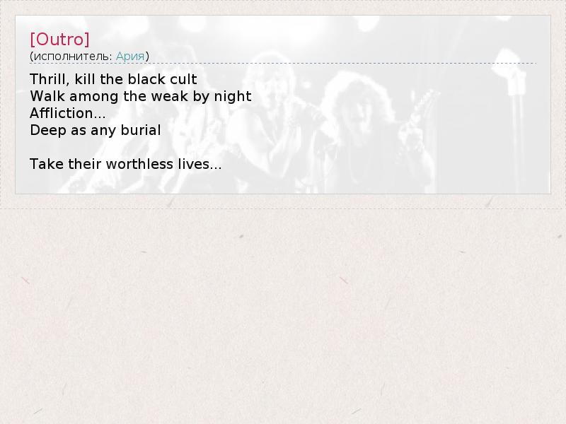 Это интересно:«Ария» — российская группа, играющая в стиле метал. Музыка «Арии» выдержана в стиле групп «новой волны британского хеви-метала».«Ария» является одной из старейших и самых успешных метал-групп России. Лауреат премии Fuzz 2007 года как лучшая live-группа. Её участниками были образованы многие другие известные группы («Мастер», «Кипелов», «Маврик», «Артерия»), которые вместе составляют плеяду,... продолжение