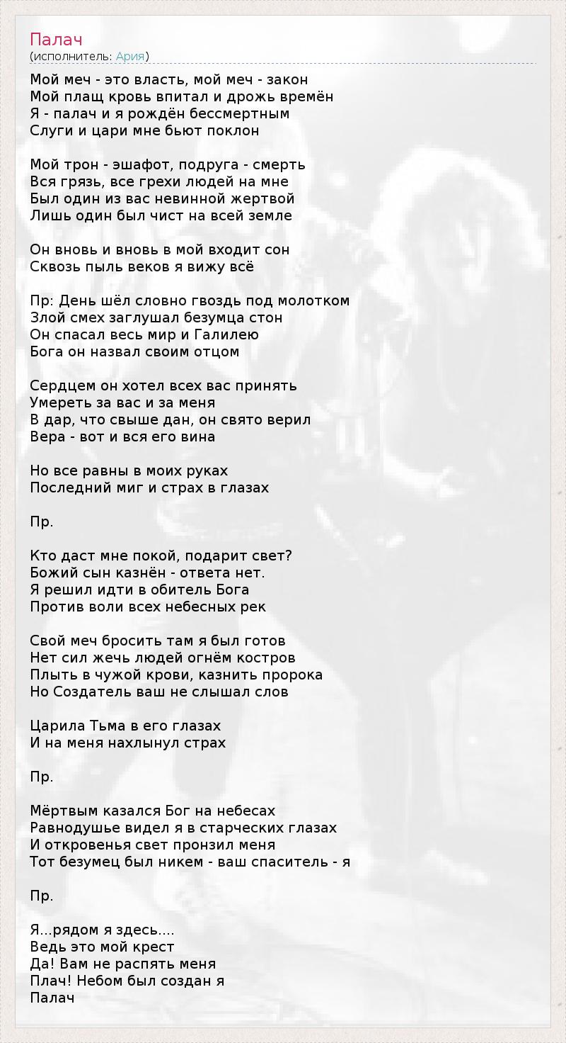 Мой меч - это власть, мой меч - закон Мой плащ кровь впитал и дрожь времён Я - палач и я рождён бессмертным Слуги и цари мне бьют поклон Мой трон - эшафот, подруга - смерть Вся грязь, все грехи людей на мне Был один из вас невинной жертвой Лишь один был чист на всей земле Он вновь и вновь в мой входит сон Сквозь пыль веков я вижу всё Пр: День шёл словно гвоздь под молотком Злой смех заглушал безумца стон Он спасал весь мир и Галилею Бога он назвал своим отцом Сердцем он хотел всех вас принять Умереть за вас и за меня В дар, что свыше дан, он свято верил Вера - вот и вся его вина Но все равны в моих руках Последний миг и страх в глазах Пр. Кто даст мне покой, подарит свет? Божий сын казнён - ответа нет. Я решил идти в обитель Бога Против воли всех небесных рек Свой меч бросить там я был готов Нет сил жечь людей огнём костров Плыть в чужой крови, казнить пророка Но Создатель ваш не слышал слов Царила Тьма в его глазах И на меня нахлынул страх Пр. Мёртвым казался Бог на небесах Равнодушье видел я в старческих глазах И откровенья свет пронзил меня Тот безумец был никем - ваш спаситель - я Пр. Я...рядом я здесь.... Ведь это мой крест Да! Вам не распять меня Плач! Небом был создан я Палач