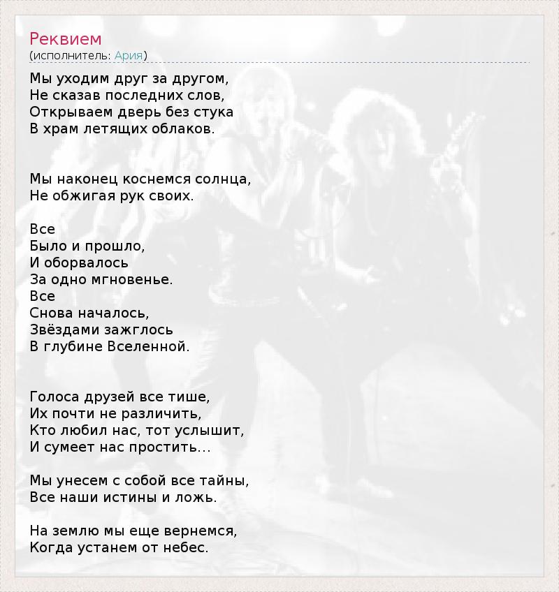 Это интересно:«Ария» — российская группа, играющая в стиле метал. Музыка «Арии» выдержана в стиле групп «новой волны британского хеви-метала».«Ария» является одной из старейших и самых успешных метал-групп России. Лауреат премии Fuzz 2007 года как лучшая live-группа. Её участниками были образованы многие другие известные группы («Мастер», «Кипелов», «Маврик», «Артерия»), которые вместе составляют плеяду,... продолжение