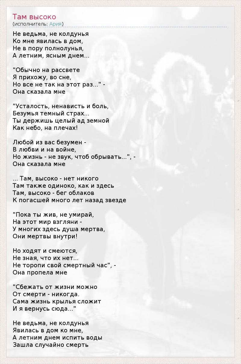 Ария - Там высоко http://megalyrics.ru/lyric/%D0%B0%D1%80%D0%B8%D1%8F/%D1%82%D0%B0%D0%BC-%D0%B2%D1%8B%D1%81%D0%BE%D0%BA%D0%BE.htm#ixzz1wvJ3Mx5r