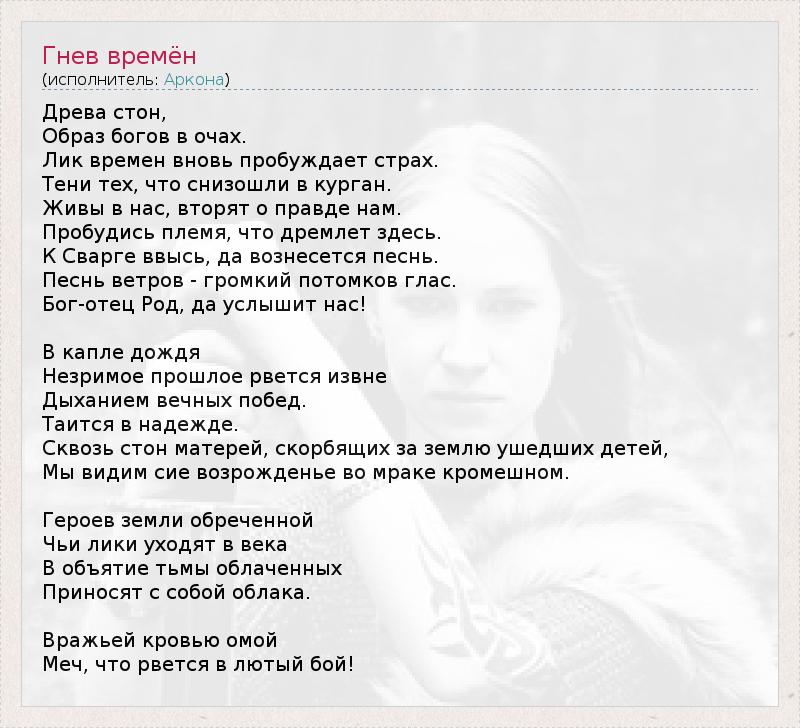 Аркона - Гнев времен http://megalyrics.ru/lyric/%D0%B0%D1%80%D0%BA%D0%BE%D0%BD%D0%B0/%D0%B3%D0%BD%D0%B5%D0%B2-%D0%B2%D1%80%D0%B5%D0%BC%D0%B5%D0%BD.htm#ixzz22xSvXAo2