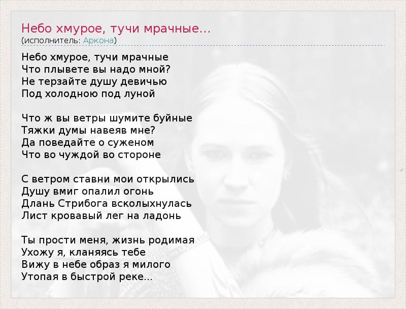 Небо хмурое, тучи мрачные Что плывете вы надо мной? Не терзайте душу девичью Под холодною под луной Что ж вы ветры шумите буйные Тяжки думы навеяв мне? Да поведайте о суженом Что во чуждой во стороне С ветром ставни мои открылись Душу вмиг опалил огонь Длань Стрибога всколыхнулась Лист кровавый лег на ладонь Ты прости меня, жизнь родимая Ухожу я, кланяясь тебе Вижу в небе образ я милого Утопая в быстрой реке...