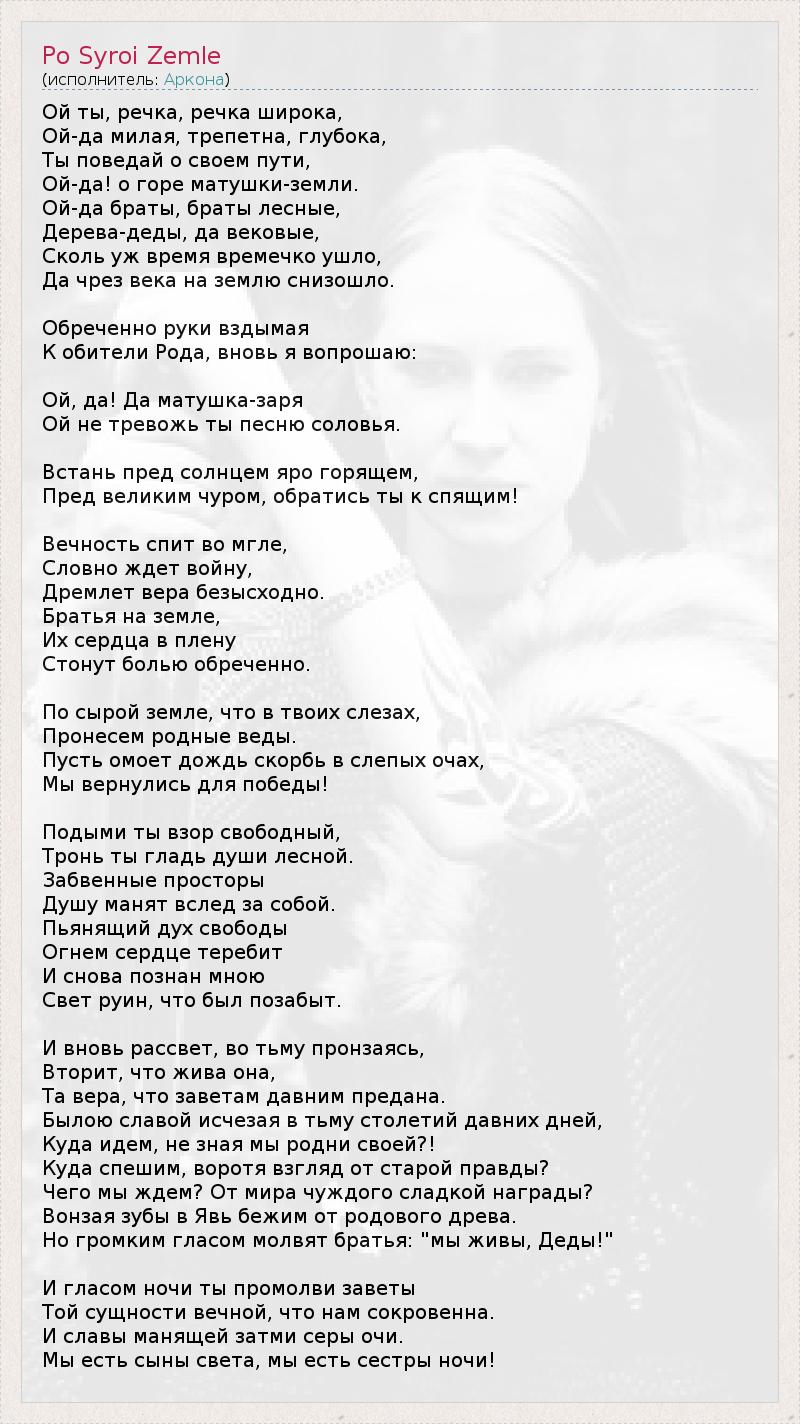Ой ты, речка, речка широка, Ой-да милая, трепетна, глубока, Ты поведай о своем пути, Ой-да! о горе матушки-земли. Ой-да браты, браты лесные, Дерева-деды, да вековые, Сколь уж время времечко ушло, Да чрез века на землю снизошло. Обреченно руки вздымая К обители Рода, вновь я вопрошаю: Ой, да! Да матушка-заря Ой не тревожь ты песню соловья. Встань пред солнцем яро горящем, Пред великим чуром, обратись ты к спящим! Вечность спит во мгле, Словно ждет войну, Дремлет вера безысходно. Братья на земле, Их сердца в плену Стонут болью обреченно. По сырой земле, что в твоих слезах, Пронесем родные веды. Пусть омоет дождь скорбь в слепых очах, Мы вернулись для победы! Подыми ты взор свободный, Тронь ты гладь души лесной. Забвенные просторы Душу манят вслед за собой. Пьянящий дух свободы Огнем сердце теребит И снова познан мною Свет руин, что был позабыт. И вновь рассвет, во тьму пронзаясь, Вторит, что жива она, Та вера, что заветам давним предана. Былою славой исчезая в тьму столетий давних дней, Куда идем, не зная мы родни своей?! Куда спешим, воротя взгляд от старой правды? Чего мы ждем? От мира чуждого сладкой награды? Вонзая зубы в Явь бежим от родового древа. Но громким гласом молвят братья: "мы живы, Деды!" И гласом ночи ты промолви заветы Той сущности вечной, что нам сокровенна. И славы манящей затми серы очи. Мы есть сыны света, мы есть сестры ночи! Аркона - По сырой земле http://megalyrics.ru/lyric/%D0%B0%D1%80%D0%BA%D0%BE%D0%BD%D0%B0/%D0%BF%D0%BE-%D1%81%D1%8B%D1%80%D0%BE%D0%B9-%D0%B7%D0%B5%D0%BC%D0%BB%D0%B5.htm#ixzz22xRo7GCw