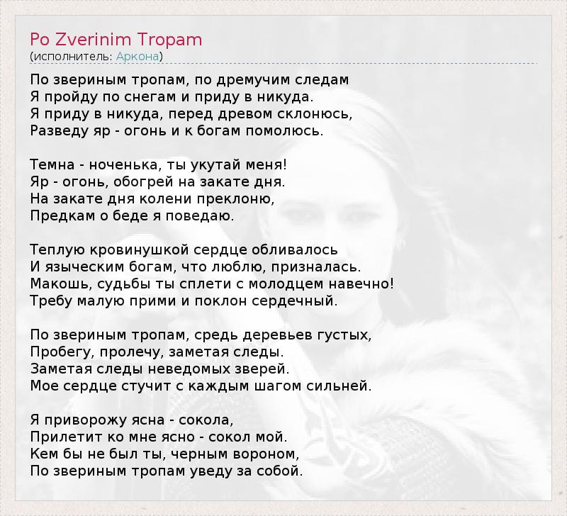 Аркона - По звериным тропам http://megalyrics.ru/lyric/%D0%B0%D1%80%D0%BA%D0%BE%D0%BD%D0%B0/%D0%BF%D0%BE-%D0%B7%D0%B2%D0%B5%D1%80%D0%B8%D0%BD%D1%8B%D0%BC-%D1%82%D1%80%D0%BE%D0%BF%D0%B0%D0%BC.htm#ixzz22xSnDcU4