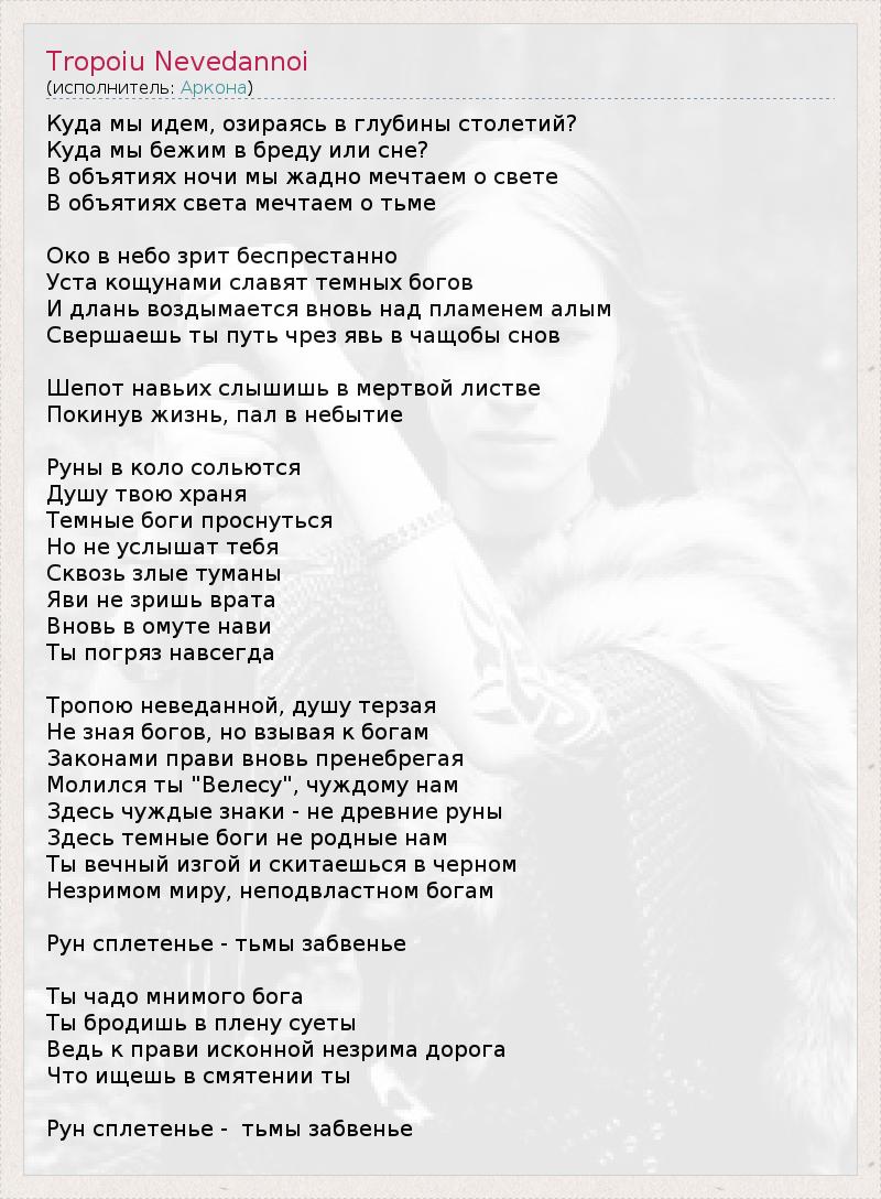Куда мы идем, озираясь в глубины столетий? Куда мы бежим в бреду или сне? В объятиях ночи мы жадно мечтаем о свете В объятиях света мечтаем о тьме Око в небо зрит беспрестанно Уста кощунами славят темных богов И длань воздымается вновь над пламенем алым Свершаешь ты путь чрез явь в чащобы снов Шепот навьих слышишь в мертвой листве Покинув жизнь, пал в небытие Руны в коло сольются Душу твою храня Темные боги проснуться Но не услышат тебя Сквозь злые туманы Яви не зришь врата Вновь в омуте нави Ты погряз навсегда Тропою неведанной, душу терзая Не зная богов, но взывая к богам Законами прави вновь пренебрегая Молился ты "Велесу", чуждому нам Здесь чуждые знаки - не древние руны Здесь темные боги не родные нам Ты вечный изгой и скитаешься в черном Незримом миру, неподвластном богам Рун сплетенье - тьмы забвенье Ты чадо мнимого бога Ты бродишь в плену суеты Ведь к прави исконной незрима дорога Что ищешь в смятении ты Рун сплетенье - тьмы забвенье