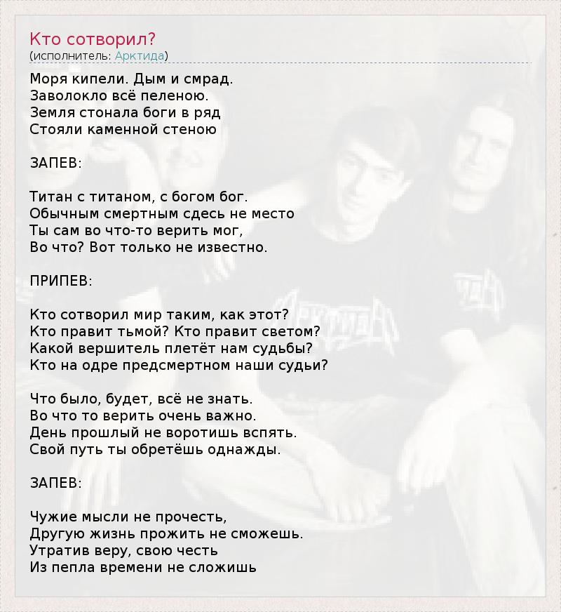 Моря кипели. Дым и смрад. Заволокло всё пеленою. Земля стонала боги в ряд Стояли каменной стеною ЗАПЕВ: Титан с титаном, с богом бог. Обычным смертным сдесь не место Ты сам во что-то верить мог, Во что? Вот только не известно. ПРИПЕВ: Кто сотворил мир таким, как этот? Кто правит тьмой? Кто правит светом? Какой вершитель плетёт нам судьбы? Кто на одре предсмертном наши судьи? Что было, будет, всё не знать. Во что то верить очень важно. День прошлый не воротишь вспять. Свой путь ты обретёшь однажды. ЗАПЕВ: Чужие мысли не прочесть, Другую жизнь прожить не сможешь. Утратив веру, свою честь Из пепла времени не сложишь