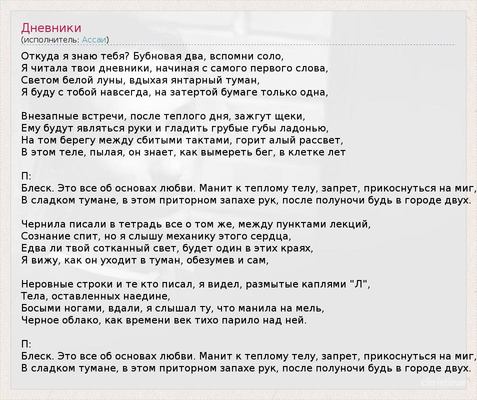 Откуда я знаю тебя? Бубновая два, вспомни соло, Я читала твои дневники, начиная с самого первого слова, Светом белой луны, вдыхая янтарный туман, Я буду с тобой навсегда, на затертой бумаге только одна, Внезапные встречи, после теплого дня, зажгут щеки, Ему будут являться руки и гладить грубые губы ладонью, На том берегу между сбитыми тактами, горит алый рассвет, В этом теле, пылая, он знает, как вымереть бег, в клетке лет П: Блеск. Это все об основах любви. Манит к теплому телу, запрет, прикоснуться на миг, В сладком тумане, в этом приторном запахе рук, после полуночи будь в городе двух. Чернила писали в тетрадь все о том же, между пунктами лекций, Сознание спит, но я слышу механику этого сердца, Едва ли твой сотканный свет, будет один в этих краях, Я вижу, как он уходит в туман, обезумев и сам, Неровные строки и те кто писал, я видел, размытые каплями "Л", Тела, оставленных наедине, Босыми ногами, вдали, я слышал ту, что манила на мель, Черное облако, как времени век тихо парило над ней. П: Блеск. Это все об основах любви. Манит к теплому телу, запрет, прикоснуться на миг, В сладком тумане, в этом приторном запахе рук, после полуночи будь в городе двух.