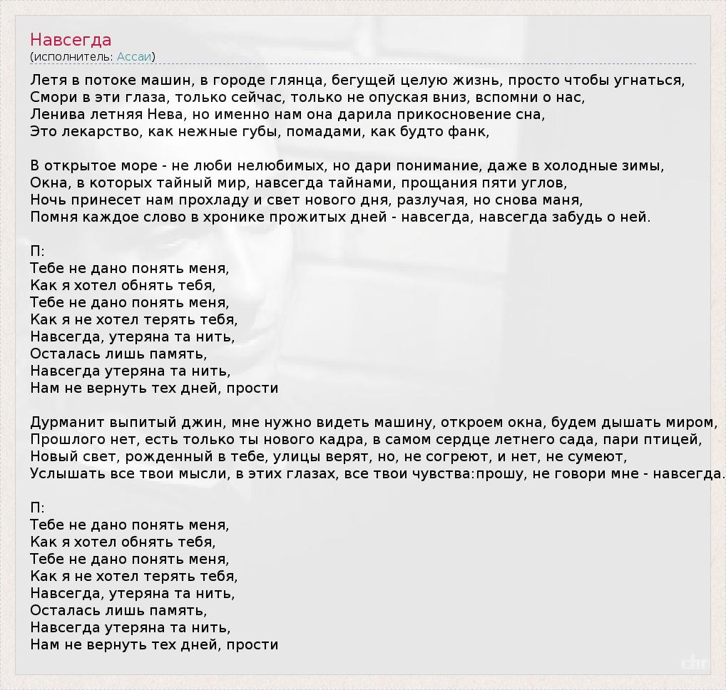 Летя в потоке машин, в городе глянца, бегущей целую жизнь, просто чтобы угнаться, Смори в эти глаза, только сейчас, только не опуская вниз, вспомни о нас, Ленива летняя Нева, но именно нам она дарила прикосновение сна, Это лекарство, как нежные губы, помадами, как будто фанк, В открытое море - не люби нелюбимых, но дари понимание, даже в холодные зимы, Окна, в которых тайный мир, навсегда тайнами, прощания пяти углов, Ночь принесет нам прохладу и свет нового дня, разлучая, но снова маня, Помня каждое слово в хронике прожитых дней - навсегда, навсегда забудь о ней. П: Тебе не дано понять меня, Как я хотел обнять тебя, Тебе не дано понять меня, Как я не хотел терять тебя, Навсегда, утеряна та нить, Осталась лишь память, Навсегда утеряна та нить, Нам не вернуть тех дней, прости Дурманит выпитый джин, мне нужно видеть машину, откроем окна, будем дышать миром, Прошлого нет, есть только ты нового кадра, в самом сердце летнего сада, пари птицей, Новый свет, рожденный в тебе, улицы верят, но, не согреют, и нет, не сумеют, Услышать все твои мысли, в этих глазах, все твои чувства:прошу, не говори мне - навсегда. П: Тебе не дано понять меня, Как я хотел обнять тебя, Тебе не дано понять меня, Как я не хотел терять тебя, Навсегда, утеряна та нить, Осталась лишь память, Навсегда утеряна та нить, Нам не вернуть тех дней, прости