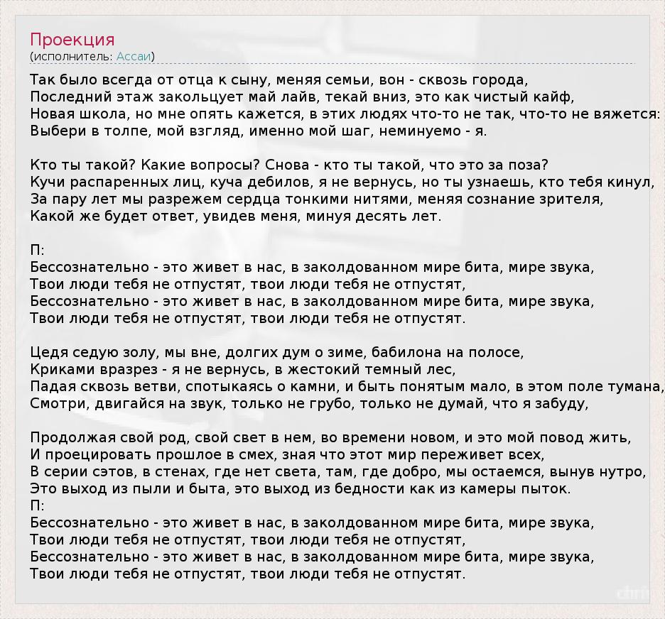 Это интересно:Ассаи (в прошлом Грязный, Санкт-Петербург) - настоящий поэт. Загадочен и притягателен. Его лирика вспоминается часто, а говорить о ней хочется редко.Стихи и голос Ассаи - это живой организм. Организм зависимый, пропащий и подавленный, безумный, с нездоровым весельем, он долго подбирает фразы, чтобы донести свою информацию Вашему уху. Цепочки этих слов, остановки, дубли, резкие вдохи перед... продолжение