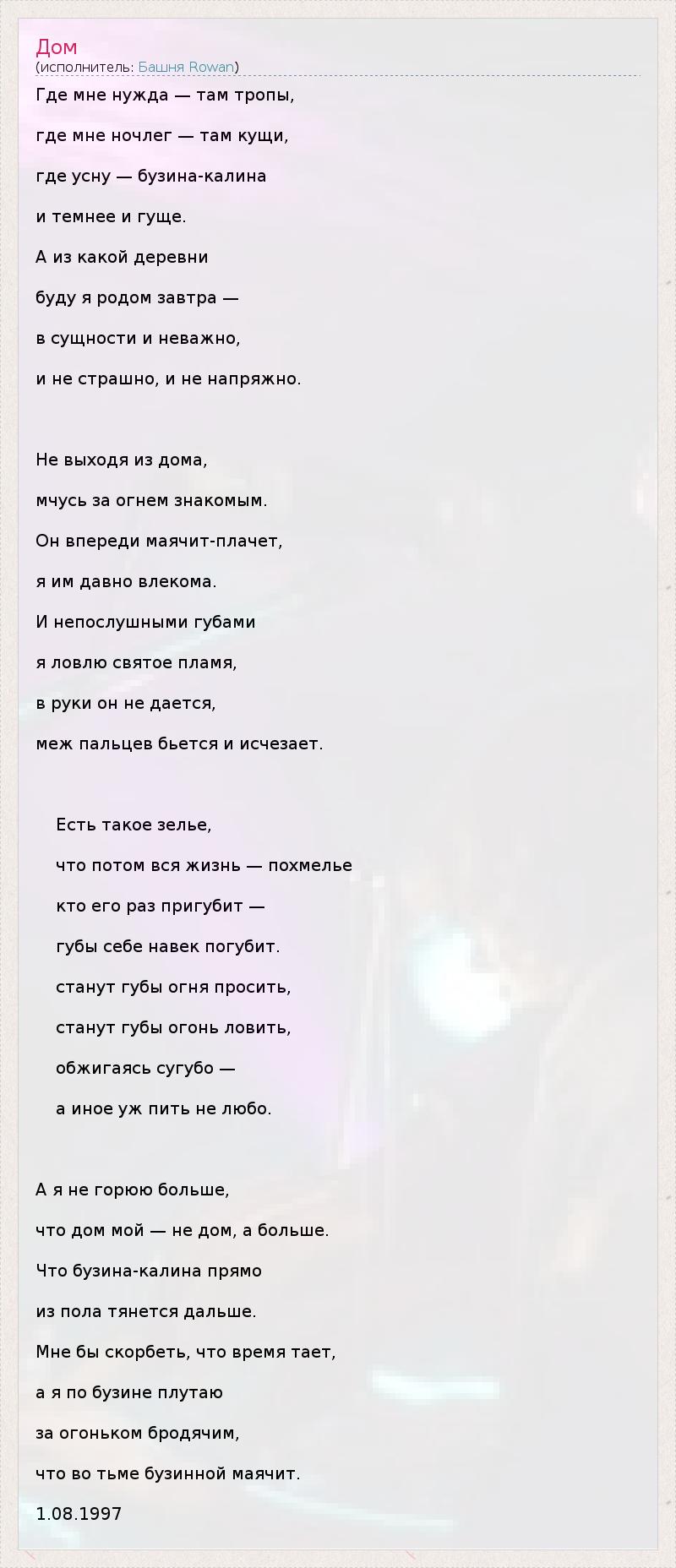 Это интересно:Башня Rowan — музыкальная группа, работающая на стыке рока, джаза, фолка и психоделики. Коллектив образовался в 1995 году как фолк-группа, и в результате долгих творческих поисков превратилась в коллектив, играющий неповторимую и необычную музыку.Группа распалась в январе 2010.