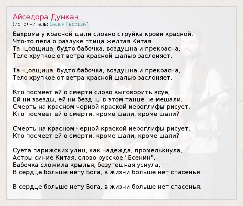Это интересно:Годом рождения группы можно считать 1993 год, когда Зоя Ященко записала первый сольный альбом с одноимённым названием «Белая гвардия». Тогда же состоялись первые сольные концерты в Москве в концертных залах Олимпийской деревни, ДК МЭИ, ДК «Меридиан»,... продолжение
