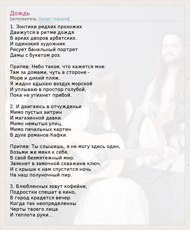Это интересно:Годом рождения группы можно считать 1993 год, когда Зоя Ященко записала первый сольный альбом с одноимённым названием «Белая гвардия». Тогда же состоялись первые сольные концерты в Москве в концертных залах Олимпийской деревни, ДК МЭИ, ДК «Меридиан»,... продолжение